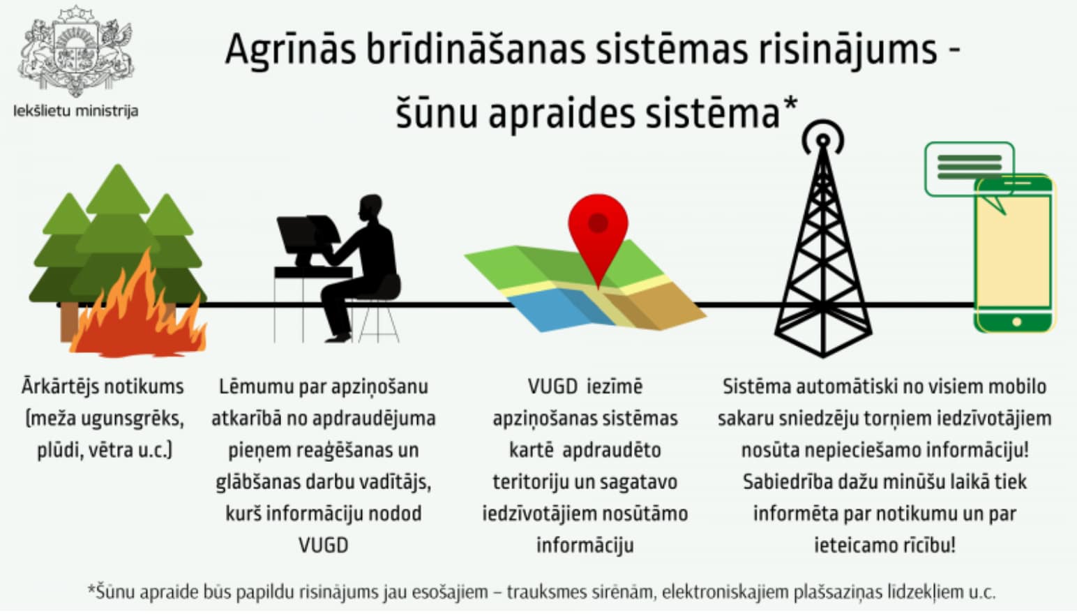 Turklāt šī gada janvārī stājās spēkā Valsts civilās aizsardzības plāna atjaunotā redakcija, kas nosaka, ka izpildes termiņš iedzīvotāju informēšanai un rīcības ieteikumu sniegšanai palu, plūdu vai vējuzplūdu gadījumā ir 30 minūtes. Līdz šim šis termiņš bija ar norādi “pēc nepieciešamības”.